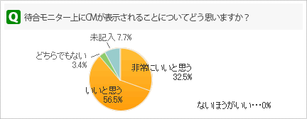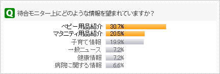 放映を行った産婦人科3施設で行ったアンケート結果。有効回答数207名診療予約受付システムの待合モニターでは、医療機関からのお知らせ、リアルタイムでの診察待ち順番状況表示、診察呼び出しにも使用していますので患者様のモニター注目度が高いのが特長です。