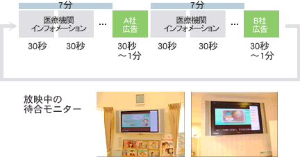 インフォメーショの数は医療機関によって様々ですが、CM放映は1サイクル7分毎に必ず1CMが 放映されるようになっております。
